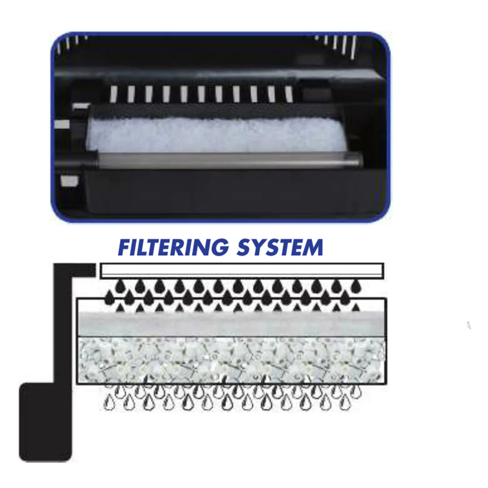 Filtro interno a cascata con pompa di riciclo assicura una filtrazione efficiente dell'acqua, mantenendola cristallina e creando un ambiente sano per pesci e piante.